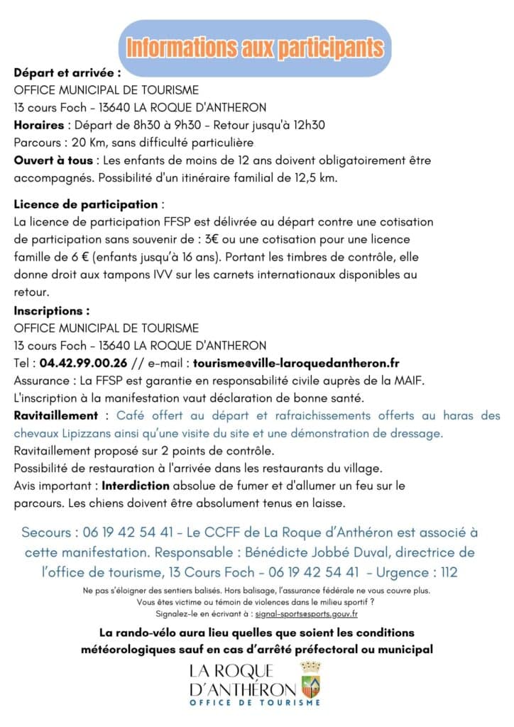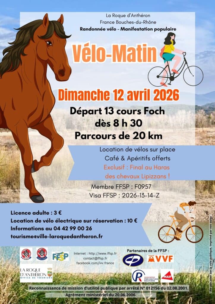 Le dimanche 12 avril, l'office de tourisme de la Roque D'Anthéron vous invite à participer au Vélo-Matin. Prenez le départ à vélo devant l'office de tourisme entre 8h30 et 9h30, votre licence FFSP en poche (3€ pour les +16 ans), et parcourez les berges de la Durance jusqu’à l’épi du Colombier (Charleval). De retour à La Roque d’Anthéron faites une halte au prestigieux Conservatoire du cheval Lipizzan pour une démonstration de dressage et un dernier rafraîchissement. La boucle complète fait 20 km, elle ne présente aucune difficulté ! Juste le plaisir de se remettre au vélo en douceur.