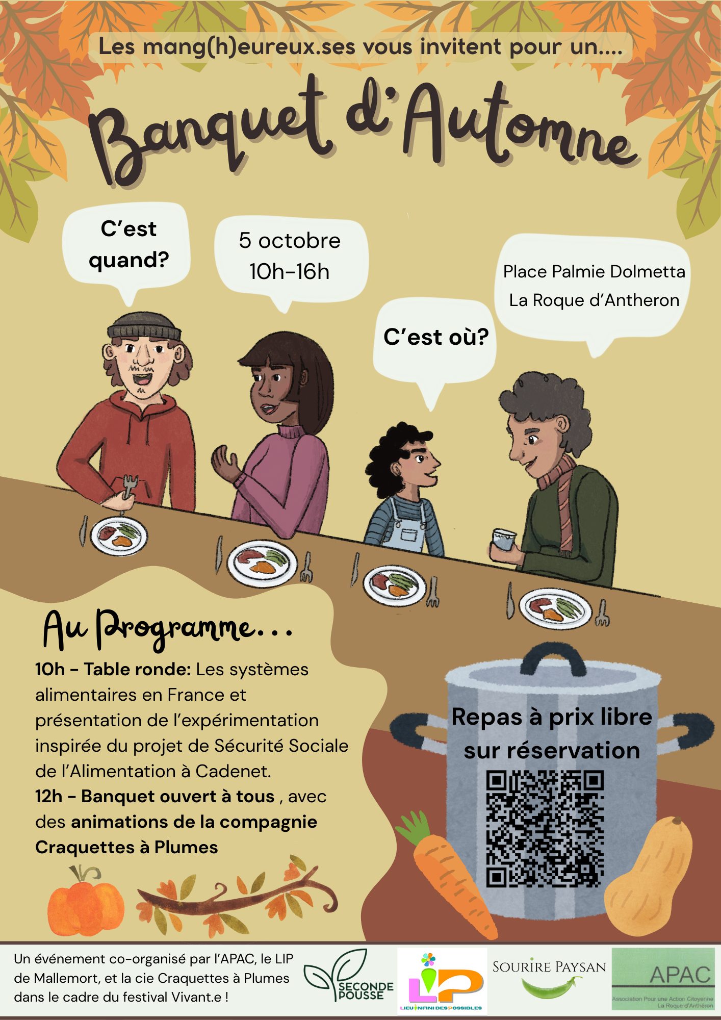 - A partir de 12h00 : un grand banquet local ouvert à tous (sur réservation), cuisiné par nos soins et des animations proposées par la compagnie Craquette à plumes !