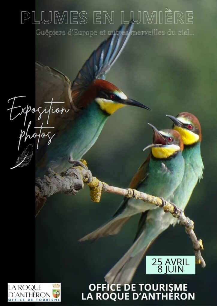 L’exposition photo « Plumes en lumière » est présentée dans la salle du rez-de-chaussée de l’Office de tourisme. Elle montre les guêpiers d’Europe et divers passereaux et met en lumière les magnifiques couleurs de ces oiseaux, véritables merveilles du ciel.